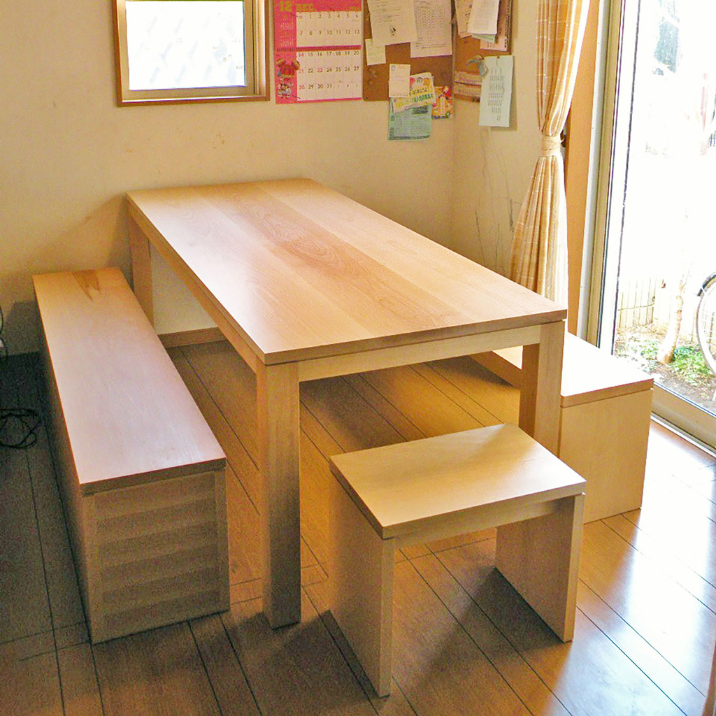 丈夫で粘りの強いブナで制作したテーブルセットです。子沢山の7人家族。
