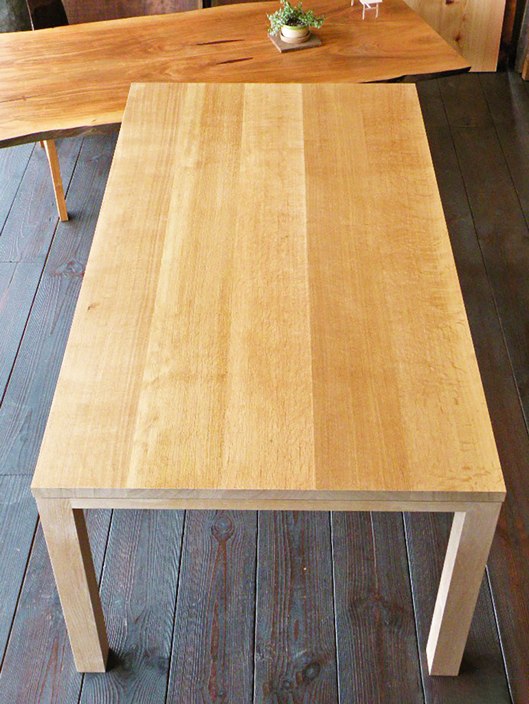ミズナラの柾目材5枚はぎの天板です。脚も四方柾のとてもきれいな脚で作り上げているところがこだわりです。