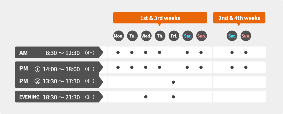 - ※ Attendance times are generally fixed, but we also offer makeup class options.